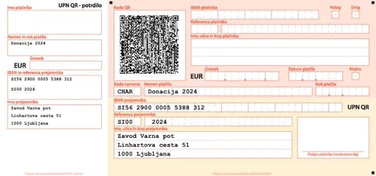 Koda namena: CHAR IBAN: SI56 2900 0005 5388 312 Referenca: SI00 2024 Naslov prejemnika: Zavod Varna pot, Linhartova ulica 51,