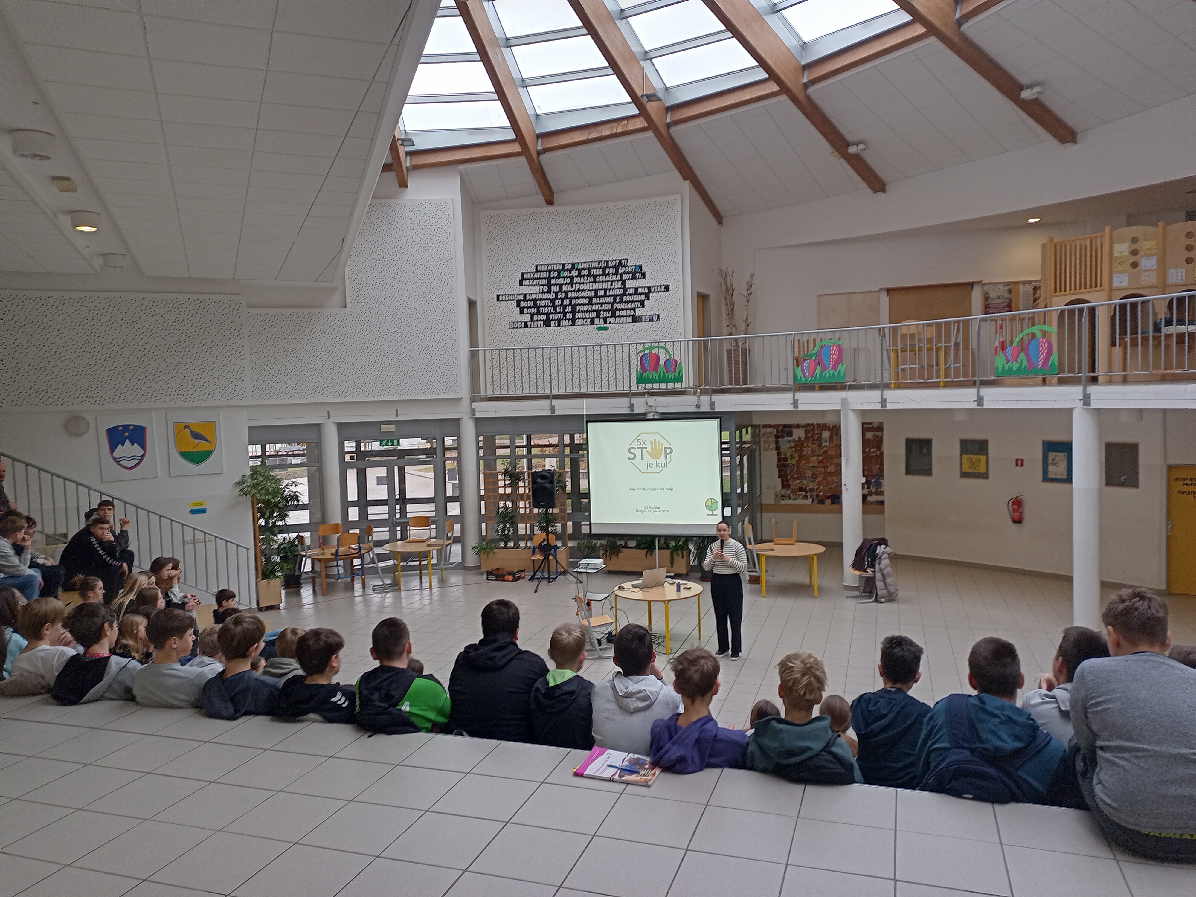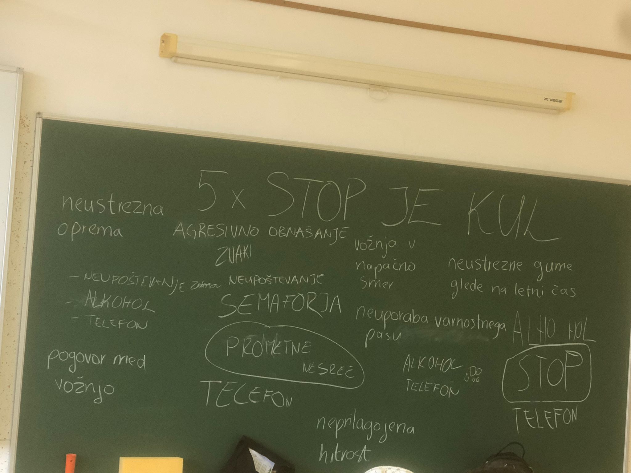 Na OŠ Antona Martina Slomška na Vrhniki je bila delavnica namenjena učencem 9. razredov, ki se nahajajo tik pred vstopom v večjo samostojnost v prometu. Skupaj smo se ustavili (tako simbolično kot tudi vsebinsko) in razmišljali, katerim petim stvarem je v prometu nujno reči STOP, če želimo zmanjšati tveganja in povečati varnost zase ter za druge. Delavnica je nadgradila že obstoječe sodelovanje s šolo, saj smo tam v preteklosti uspešno izvajali tudi druge preventivne vsebine.